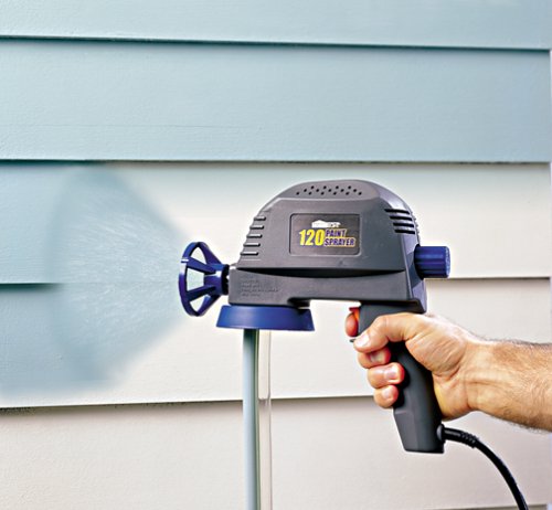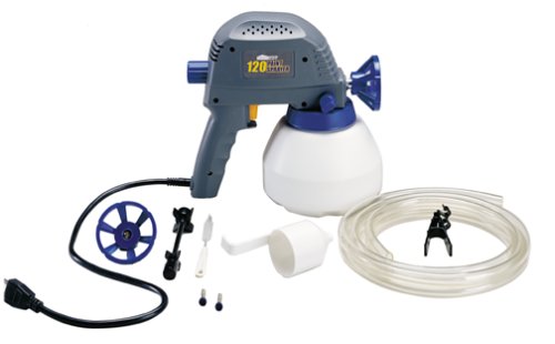 With the ability to quickly cover large surfaces such as exterior siding and fences, the HomeRight Heavy-Duty 120 Airless Paint Sprayer accommodates stains and most paints, and can spray up to 11 ounces of liquid per minute. Included with the sprayer is a tank that can hold up to 1.5-quarts of material, a 5-foot suction tube for non-stop spraying from a larger container, and two interchangeable tips for thick/thin material versatility.