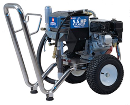 1.5 gpm Piston Airless Paint Sprayer with 5.5hp Honda engine mounted on a low boy cart. Equipped with 100 feet of high pressure hose and professional spray gun with 517 spray tip. Maximum tip size 0.028 inch when using 2 spray guns, 0.041 inch when using 1 gun. 3000 psi max pressure and 500 max hose.